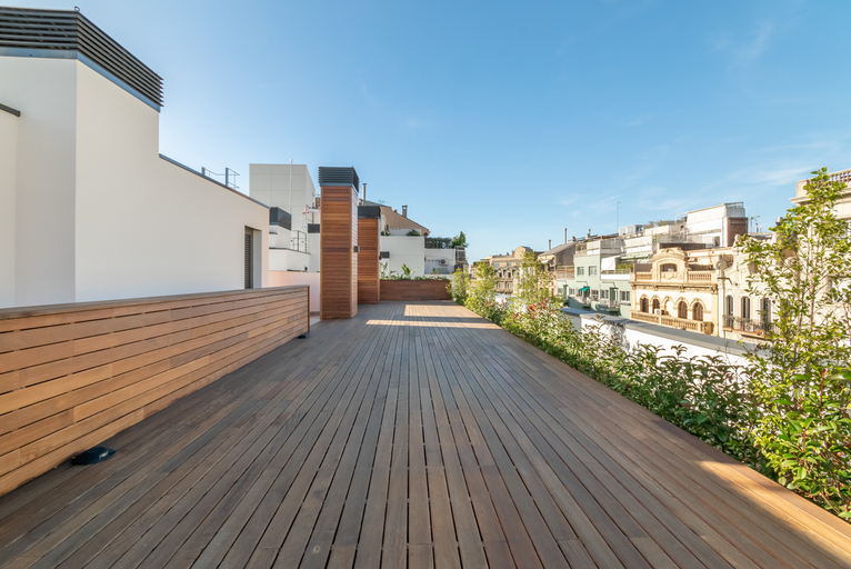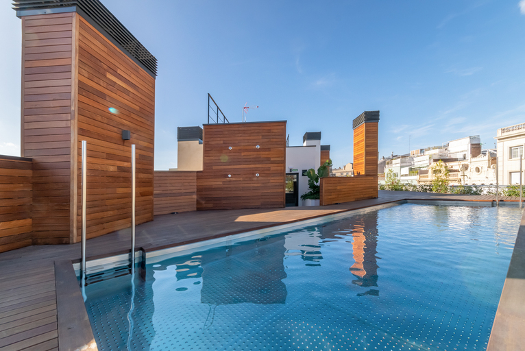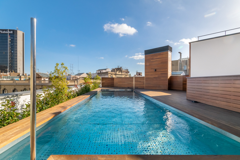 La finca cuenta con ascensor, servicio de conserjería, y un solárium en la planta superior con piscina, ofreciendo vistas panorámicas de Barcelona.